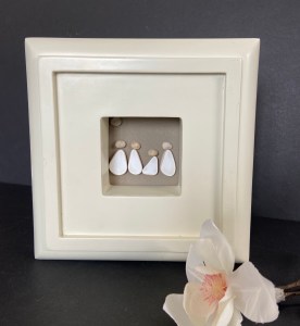 “ Art Deco Family of 4” I had the amazing luck of finding this and one other Alabaster resin frame. This statement frame is 7 1/2” x 7 1/2” and 3” deep. Frame weighs 5 pounds! These are meant to be placed on a shelf or mantel. Family is made of beach tile pieces. Price is $85.00