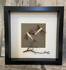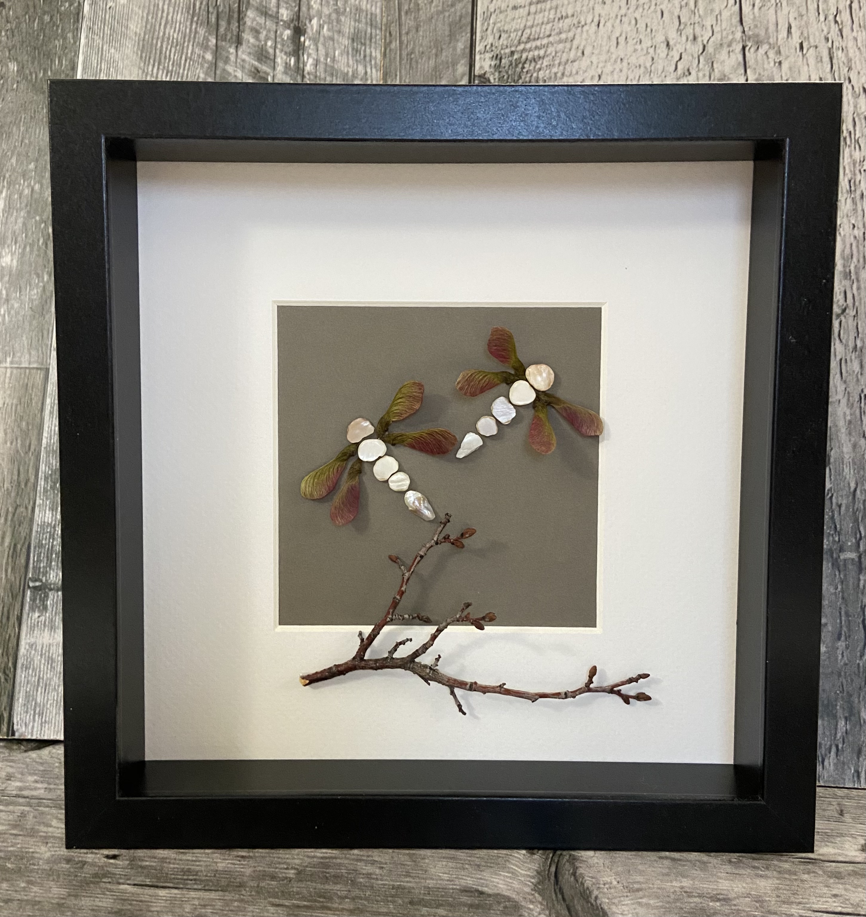 Dragonflies made of all natural materials. Framed in a 10”x10” black shadow box. Can be hung or placed on a shelf. $105.00. For sale in my Etsy shop.
